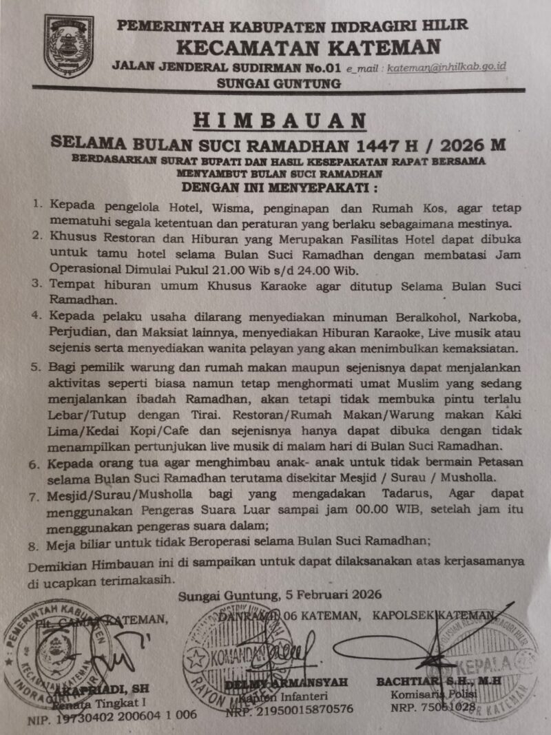 Centralmedianusa.com, Inhil-Riau – Forum Komunikasi Pimpinan Kecamatan (Forkopimcam) Kateman menerbitkan himbauan resmi sebagai pedoman bersama dalam menjaga ketertiban dan stabilitas keamanan masyarakat selama Bulan Suci Ramadan 1447 Hijriah. Kebijakan ini berlaku di Kecamatan Kateman, Kabupaten Indragiri Hilir, dengan penetapan administrasi di Sungai Guntung.