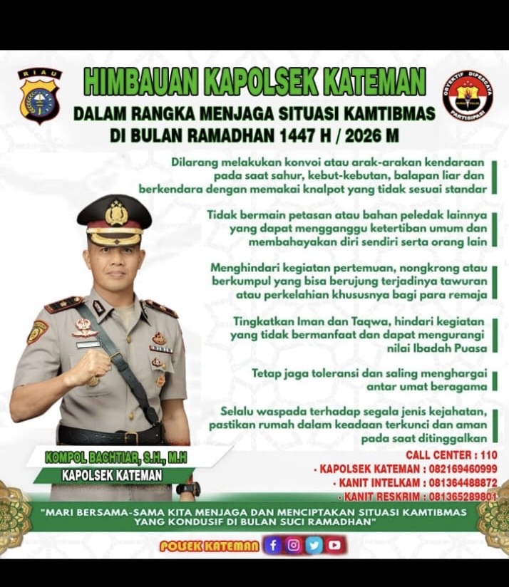 Centralmedianusa.com, Inhil-Riau – Polsek Kateman menyampaikan himbauan Kamtibmas kepada masyarakat menjelang Bulan Suci Ramadhan 1447 Hijriah/2026 Masehi. Seruan ini bertujuan menjaga ketertiban umum serta memastikan situasi wilayah tetap aman dan kondusif selama bulan ibadah, melalui peningkatan kesadaran dan peran aktif warga.